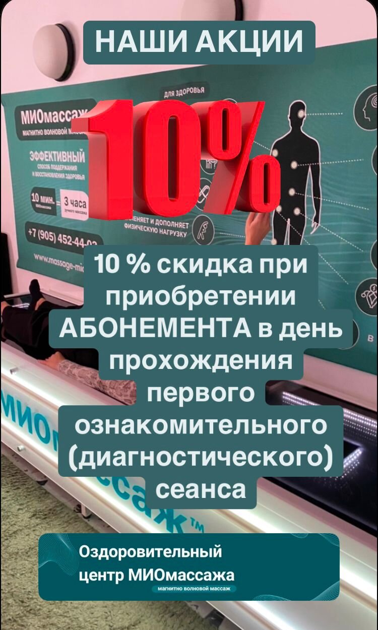 Хочу рассказать о посещении МИОмассажа, я выиграла сертификат подарочный и пришла. Потрясена - это ничего не сказать. Сам тренажёр очень красивый,помещение тоже красивое. Но, главное, это он помог, сразу после 10-тиминутного воздействия у меня прошла головная боль. Спина в области шеи, какой-то прилив кислорода. Я буду ходить однозначно и вам рекомендую!
